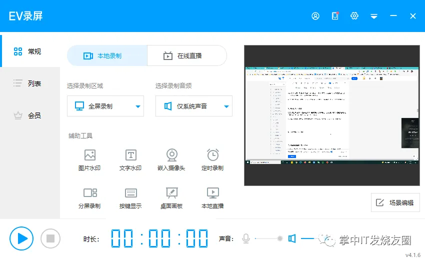 5、录制工具 EV录屏除了从网上下载视频,还有一些视频,是需要录制电脑屏幕的,比如教程类视频。但是现在很多的屏幕录制工具,要不带有水印,要不有时长限制。 EV录屏虽然也有付费版本,但免费版本用于平常录制完全没问题,不限制时长、也没有水印: