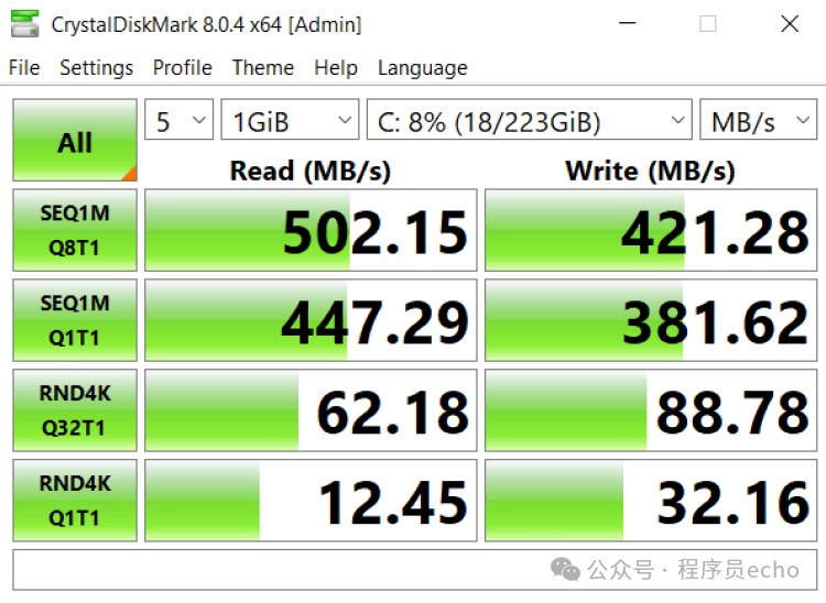 我还顺手跑了几轮 Geekbench 和 CrystalDiskMark。Geekbench 的成绩两边差不多,属于正常范围;但在磁盘测试里,Tiny10 的写入速度几乎能快出一倍,这对老硬盘或者入门级 SSD 来说,提升非常直观。