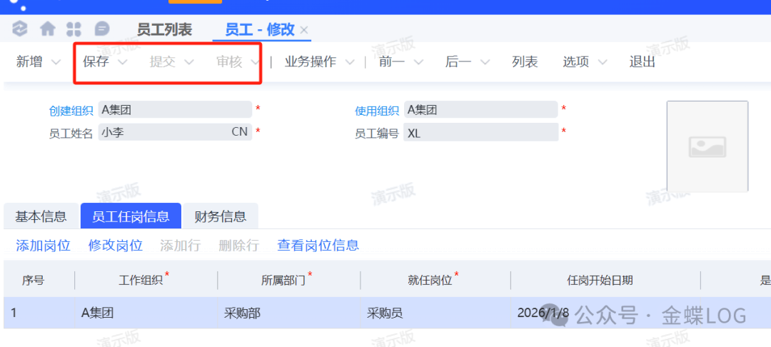 做完上面两个步骤后,【员工】和【岗位信息】都有了;这个时候需要将他们关联在一起,就需要用到系统的【员工任岗】单据。这里把【员工】、【就任岗位】选择一下;【所属部门】会根据【岗位信息】维护的部门携带过来。选完之后保存、提交、审核即可;这样【员工】和【岗位信息】就给关联绑定起来了;创建完【员工任岗信息】之后,采购申请单才能选到这名员工。