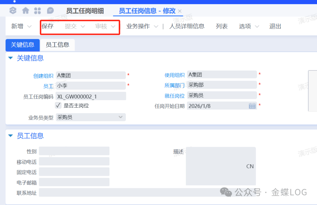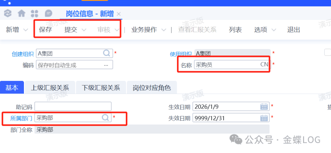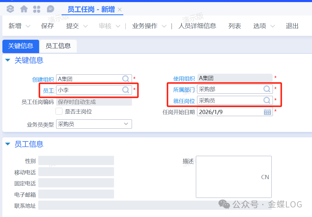 因为小李应聘的是采购部的采购员,现在员工信息建完了,还需要创建采购员这个岗位信息。在弹出的新增界面把岗位【名称】和【所属部门】维护一下,保存、提交、审核即可使用。其他字段有需要再维护。