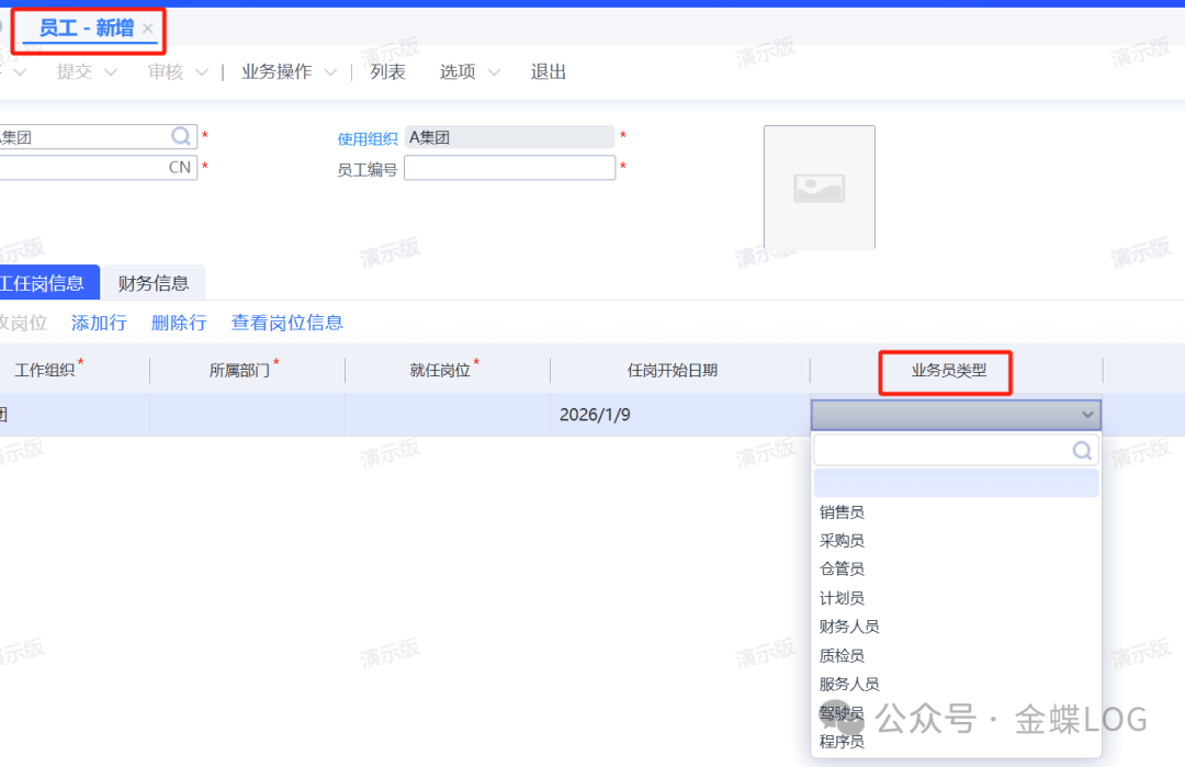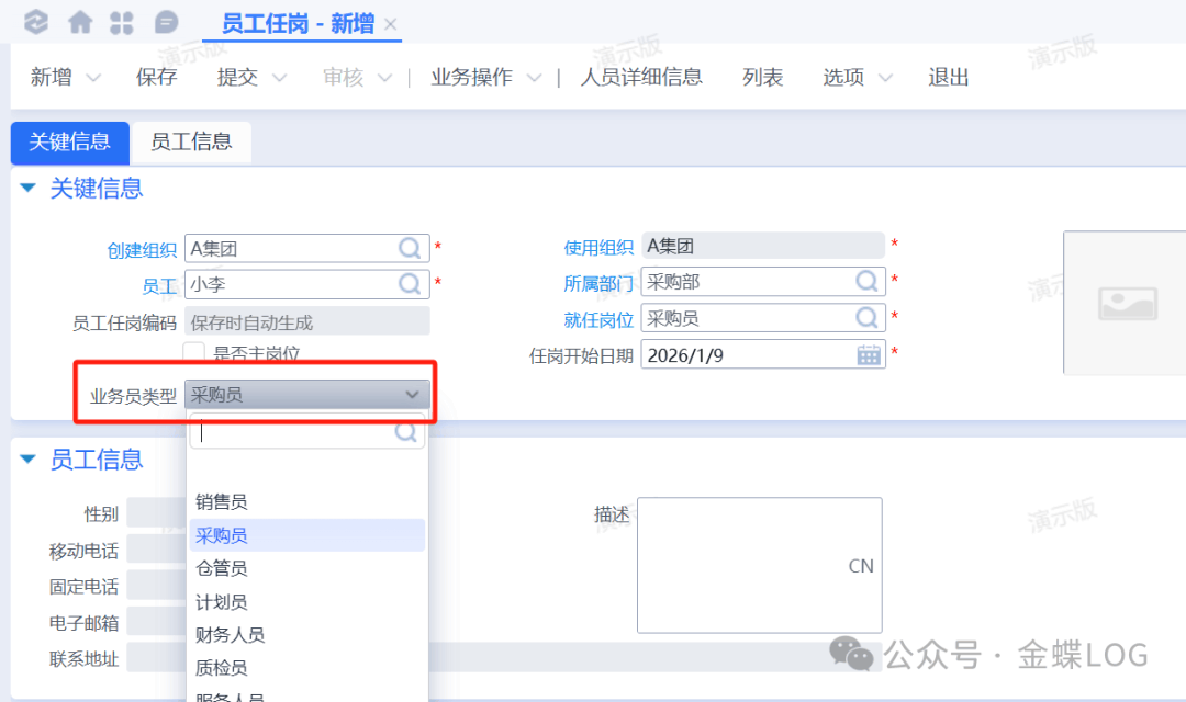 上面从【员工】到【岗位】再到【员工任岗】绑定是分了三个步骤,实际上这三个步骤可以在新增员工的时候一步到位。在员工编辑界面里,下面有个【员工任岗信息】页签,点击【添加岗位】按钮,选择一下【所属部门】和【就任岗位】,审核的时候系统会自动生成一条【员工任岗明细】。有读者应该注意到了,新增【员工任岗】里面有一个【业务员类型】字段;如果使用的账号是有新增业务员权限并且配置了自动新增的功能,在这里选了值之后,【员工】信息会自动进入到【业务员】资料里面(这个后面在讲如何新增采购员、销售员的时候会详细讲解)。