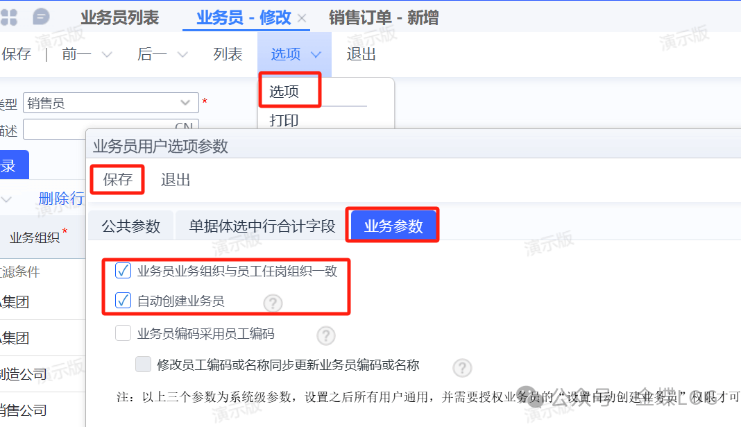 二、自动新增业务员 在系统新增员工的时候,能不能顺便也把业务员创建出来? 步骤一:先设置自动新增的参数;打开【业务员】修改界面,点击【选项】-【业务参数】,将下面两个复选框给勾上进行保存。 如果无法编辑的话,让管理员确认一下用户是否有对应权限。 步骤二:在新增【员工】的时候,同时添加【员工任岗信息】,将【业务员类型】字段选择对应值,如:销售员、采购员、仓管员等。 步骤三:将员工信息进行保存、提交、审核;再次打开【业务员】信息时,就会看到刚刚新增的员工小明。 以上便是如何新增销售员、采购员、仓管员等业务员信息。您学会了吗? 阅读原文:https://mp.weixin.qq.com/s/HIzKhQsl5pQ5QONza2oiRA 点晴模切ERP更多信息:https://moqie.clicksun.cn,联系电话:4001861886 该文章在 2026/2/24 10:49:40 编辑过 |
