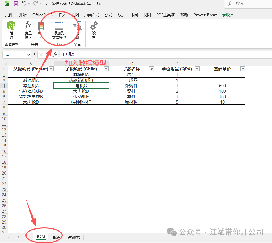 在制造业的经营分析中,BOM(物料清单)就是一切数据的“灵魂”,在大部分制造业(尤其是离散类制造业),材料成本占了70%-80%的比例,可以说是事关产品是否盈利的核心中的核心,而且材料的市场价格波动最剧烈(铜、铝、钢天天涨跌),所以老板每天盯着的,最关心的就是材料费无疑了,这是中小制造业企业的量本利动态测算的核心痛点。 很多制造企业的财务同仁在做成本分析和报价模拟时,最痛苦的莫过于:ERP导出的或者公司的BOM表单是“断层”的,特别是对于那种BOM层级很深的制造行业。 比如你想看某个成品由于底层某种“特种钢材”涨价带来的成本波动,结果发现中间隔着齿轮、齿轮箱、传动组件等五六层半成品,5、6层还算少的,多的甚至到了几十层,每一层都有不同的用量和损耗。传统的Excel函数处理如VLOOKUP只能处理一级,遇到多级嵌套的“套娃”,除了手工拉表、按计算器,似乎别无他法。而一旦工程研发部门改了bom配方,所有表格模板可能瞬间作废,财务只能连夜加班调整。 今天就带大家跳出传统的“表哥表姐”思维,从数据建模的角度,利用 Excel(PowerBI的也行)自带的 Power Pivot(数据模型)这个神器,给大家拆解演示如何搭建一个全自动的多级BOM成本穿透模拟计算工具,内容非常干。 在动手做这个工具之前,我们要先搞懂业务逻辑。我们以合肥某中小型机械制造代工厂的一个场景进行说明,假设老板问你:“如果特种钢材每公斤涨了2块钱,我们的主打产品‘减速机A’总成本会涨多少?” 要回答这个问题,得先知道减速机A的BOM构成,并且如果你不把这个减速机A的多层级BOM“展平、穿透”,你也根本回答不了这个问题。因为系统里可能只显示减速机的成本,而钢材的成本隐藏在半成品的肚子里。 我们要做的,就是造一台“X光机”,把隐藏在深处的原材料活生生地“拽”到最顶层,直接和最终成品挂钩。一旦底层单价发生变动,顶层成品的成本瞬间联动刷新。这,才叫真正的“报价联动与利润预测”,这才是能辅助老板决策的财务BP的核心价值所在。 为了让大家看透本质,下面模拟了一个制造业最典型的精简版BOM。 假设你的ERP里导出了这样一张原始基础表(共5层数据):