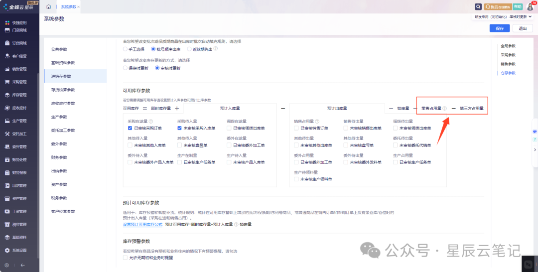 1)系统参数>进销存参数>仓存参数>可用库存公式中,库存字段进行整合,“零售占用量”、“第三方占用量”合并为“预留量”:
