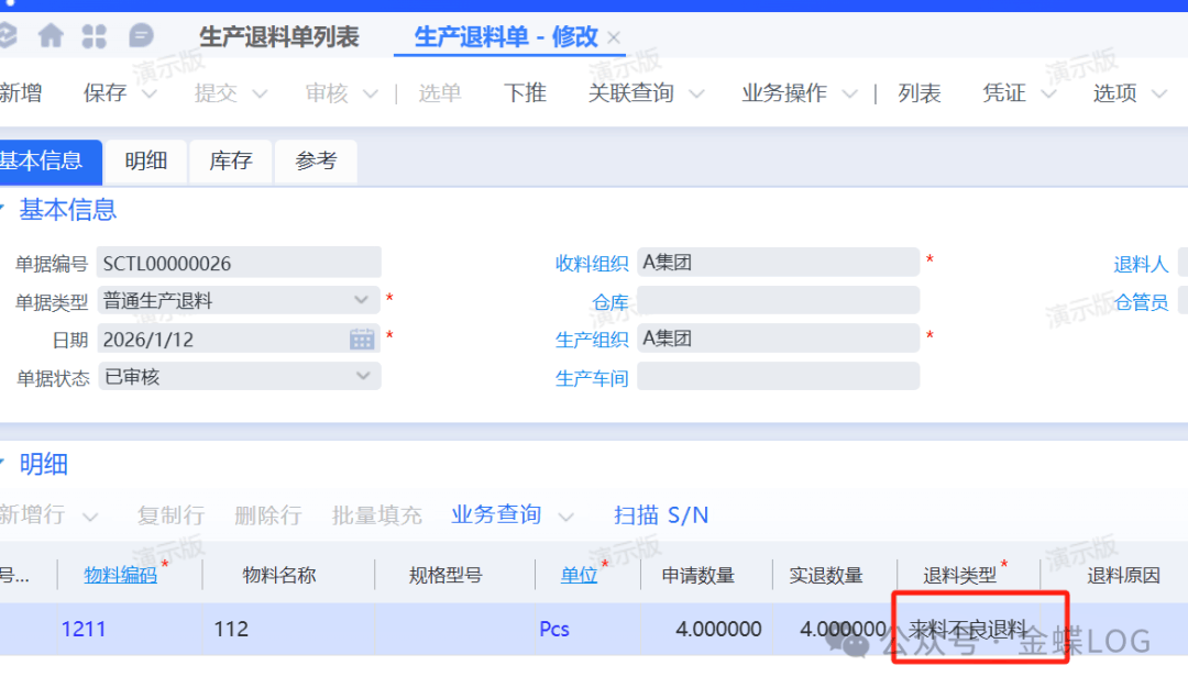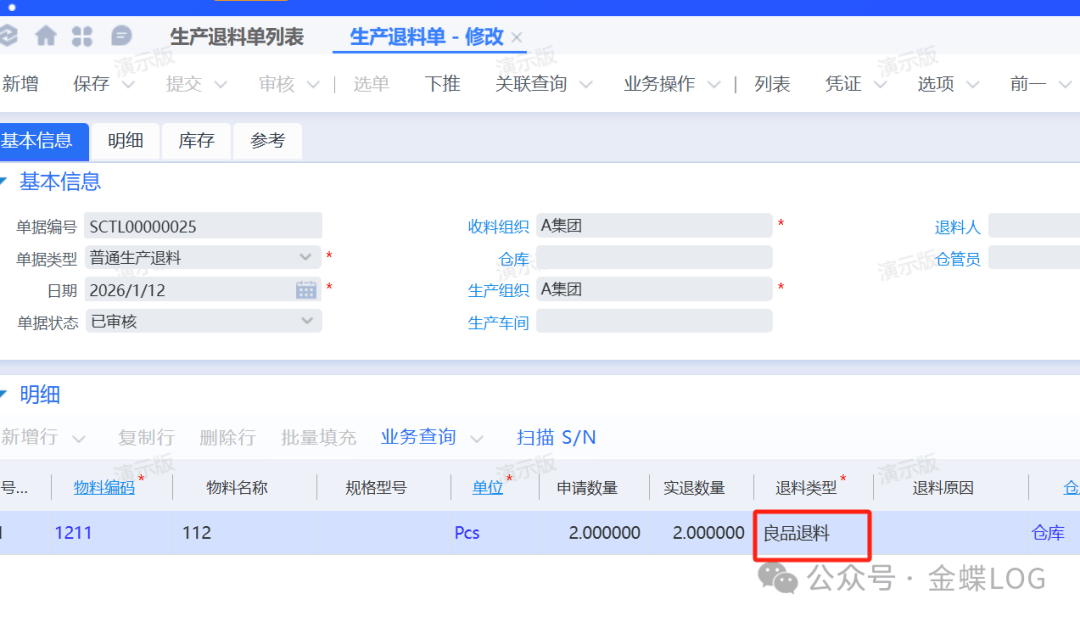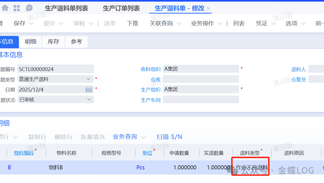 [点晴模切ERP]金蝶云星空“良品退料”、“来料不良退料”和“作业不良退料”在生产退料单上的作用