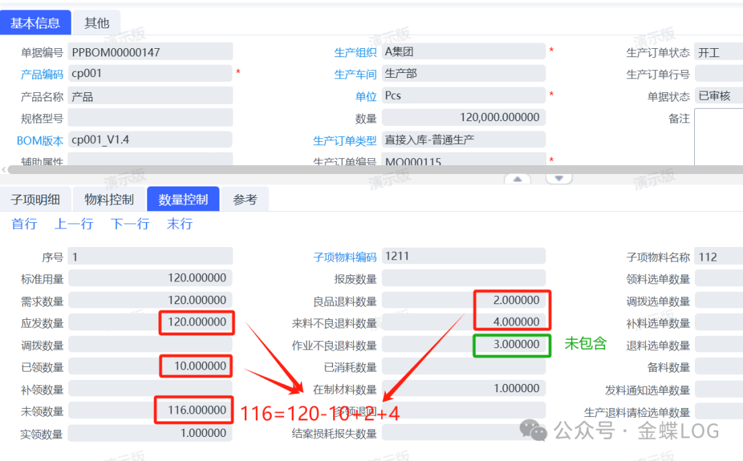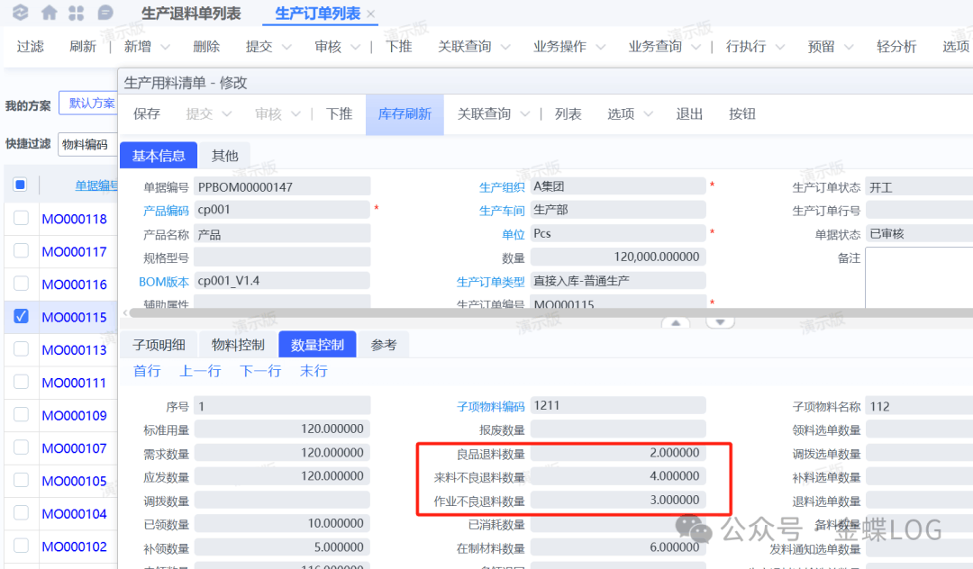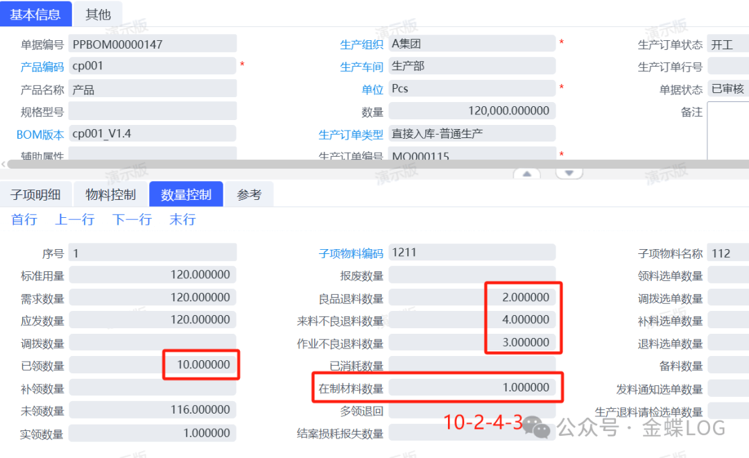 每一种退料类型在生产用料清单上都有单独的字段进行记录。他们的区别就是【作业不良退料】不会扣减未领数量,重新领料走通过补料单。比如从下图来看,3个【作业不良退料数量】(绿色)并没有扣减在【未领数量】里面;从下图可以看出,领料单领取了10个,【在制材料数量】在未退料和未入库前,数量正常来说是10个,现在三种退料类型加起来有9个,扣减之后在制数也刚好只剩下1个。从这里也可以看出,生产退料单能下推出来多少数量,跟【在制材料数量】是有关系的,如果下推的退料数量大于在制剩余数量,就会提示超额;