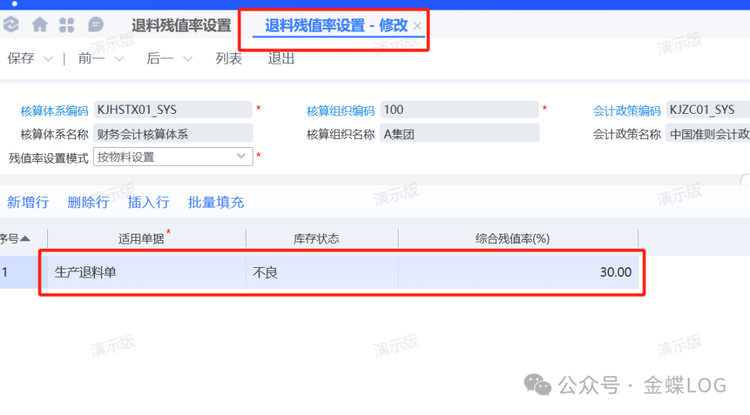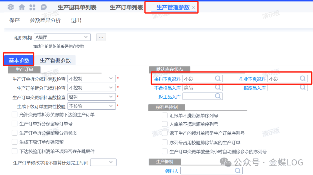 如果需要修改“来料不良退料”和“作业不良退料”的默认库存状态,可以在生产管理参数里面设置。比如退回来的默认状态为【不良】。对于【不良】或【废品】的库存状态退料,退回来的价值可能有减少,财务可以在存货模块设置对应的退料残值率(残值率后面再讲)。以上便是生产退料单上不同类型的区别。它们应用的场景不一样,大家按照实际选择;特别是要理解【作业不良退料】的不同。