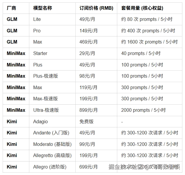 那正好了解下目前国内几家 Coding Plan 的内容,也方便大家对比。 本文仅涉及 GLM、Minimax、Kimi 3家自有产品的订阅套餐对比,像火山引擎、千问、无问芯穹类的综合套餐未加入对比。