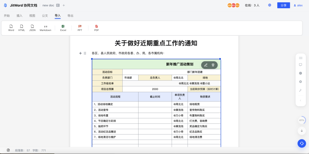 六、写在最后做协同文档产品,我们始终相信:好的功能不是"能做",而是"做得优雅"。 Office 预览这个需求,市面上99%的方案都是"能用就行",但我们愿意多花一周时间打磨嵌入体验、优化加载性能、打通文档体系。 因为办公效率的提升,往往就藏在这些"不起眼"的细节里。 如果大家也被Office文件预览困扰过,欢迎体验JitWord的新功能。 关于JitWord