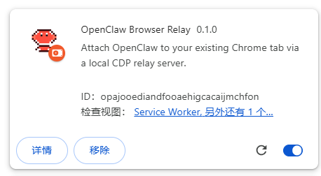 3)插件安装好之后,在扩展程序列表中,可以看到名称为:OpenClaw Browser Relay插件