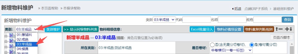 进入界面后,左侧类型选半成品类型,如下图所示: