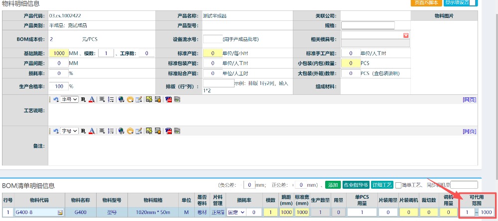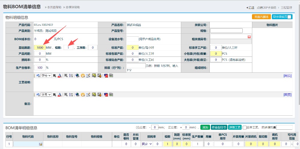 固定跳距模数原因说明:由于半成品为卷料,单位固定为M2(平方米),因此设置材料比例为1比1设置。