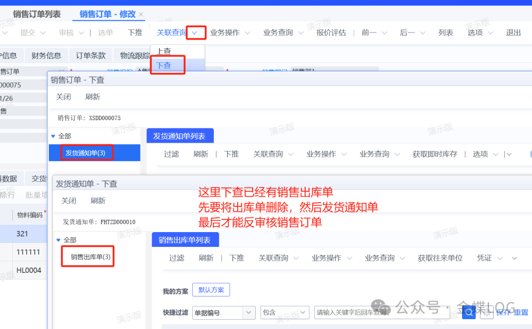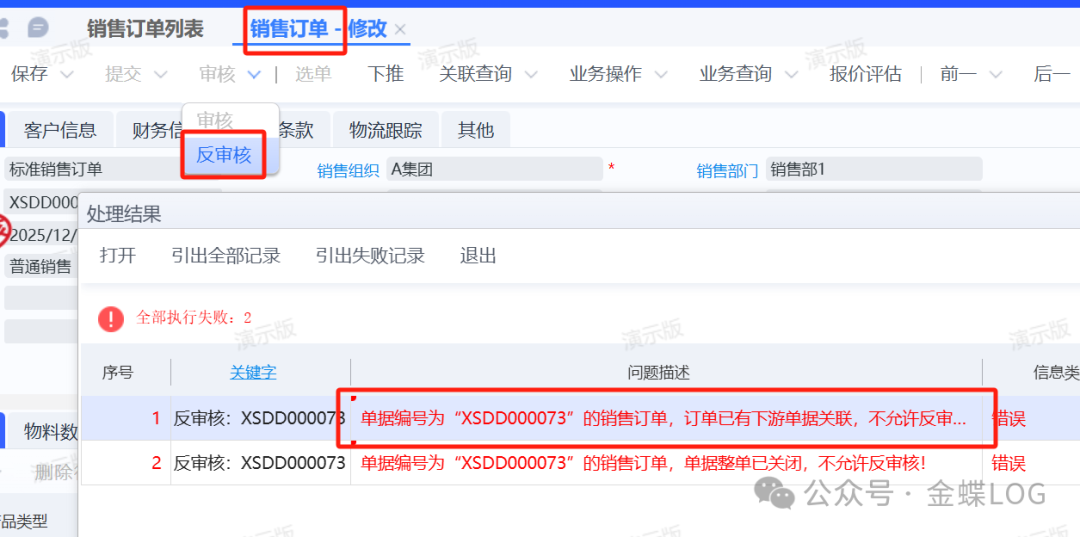 如果销售订单存在下游单据,直接反审核系统会提示:“存在下游不允许修改”。