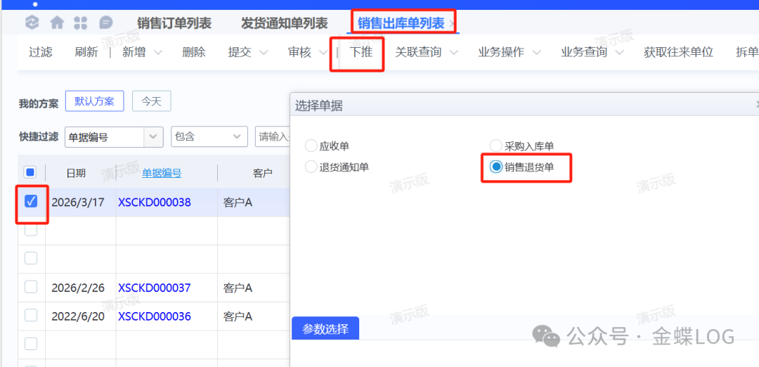 这个时候的话可以考虑从【销售出库单列表】找到错误的那行物料,勾选之后下推【销售退货单】