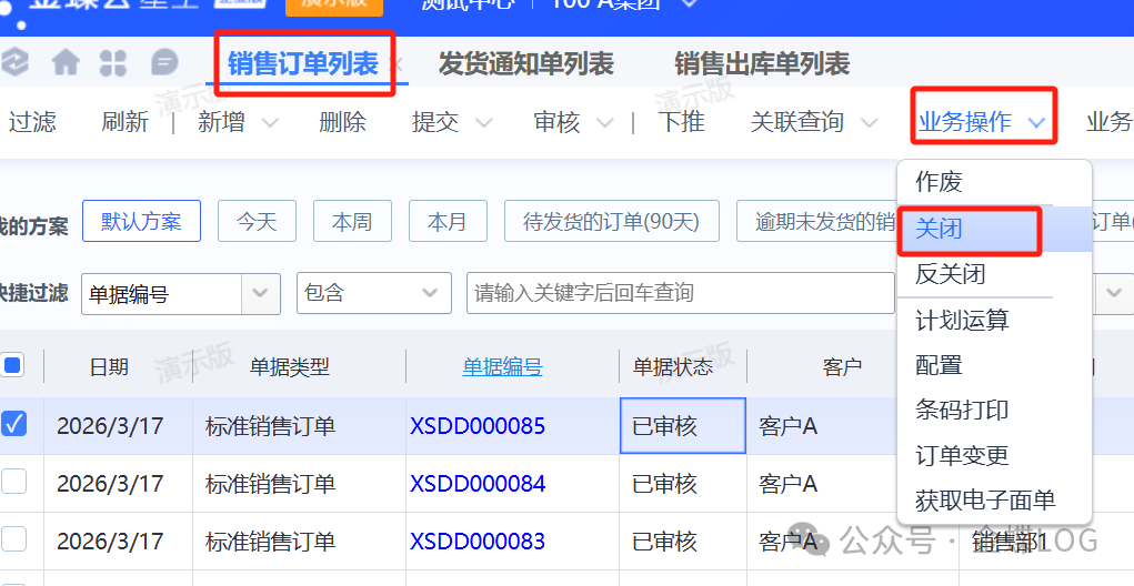 审核完退货单之后回到【销售订单列表】将订单进行关闭,重新下一张新的订单,选择正确的客户走流程。