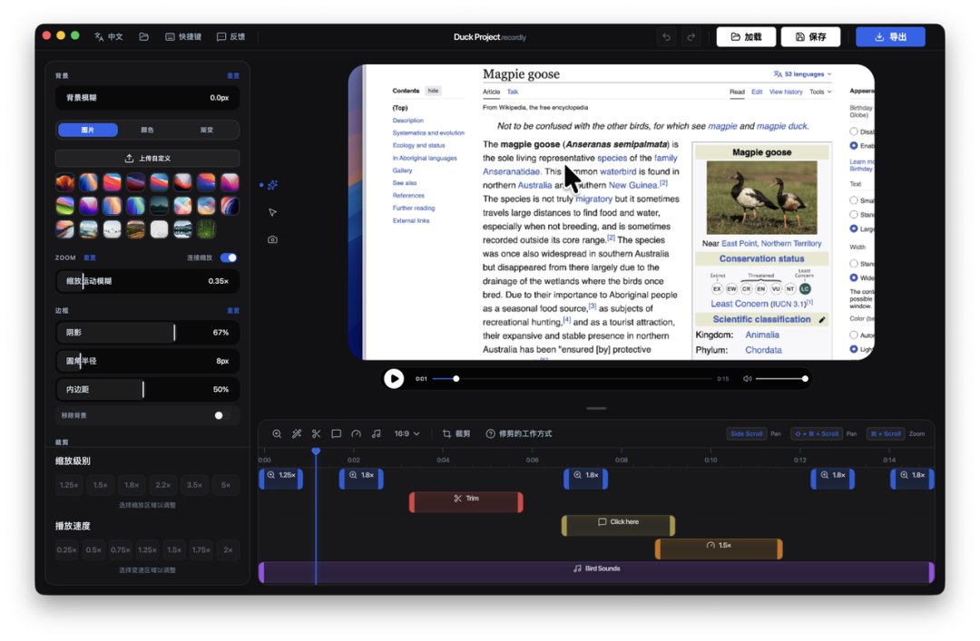 写文章、做开源项目推广、职场做产品汇报,录演示视频这事挺烦的。普通录屏软件录出来的画面干瘪枯燥,鼠标乱晃;要是导进 PR 手动加关键帧放大、加圆角阴影,那简直是给自己找罪受。Recordly 就是来解决这个问题的。一款跨平台、免费的专业级演示视频生成器。Recordly 是一个 开源的屏幕录制和编辑工具 ,专为创建精美的操作演示、产品展示、教程视频而设计。它能让你的屏幕录制视频自动变得专业,无需复杂的后期编辑!核心逻辑不是单纯"录屏",而是"录制 + 自动化后期"。录制时追踪鼠标轨迹,编辑时根据点击动作自动生成局部放大效果。还重绘了鼠标指针,加入运动模糊、点击回弹动画、轨迹平滑。就算你手抖得像帕金森,输出的视频也够稳。录完直接加渐变背景墙、圆角边框、阴影效果。不用懂什么蒙版和 Alpha 通道。想做 GIF 动图的话,有一键"指针循环"功能,首尾鼠标位置自动衔接。macOS 用苹果原生的 ScreenCaptureKit,Windows 用 C++ 写的 DXGI 捕获程序。不依赖 Electron 那套桌面捕获 API,保证了录制不卡顿,也能在系统底层隐藏真实鼠标。