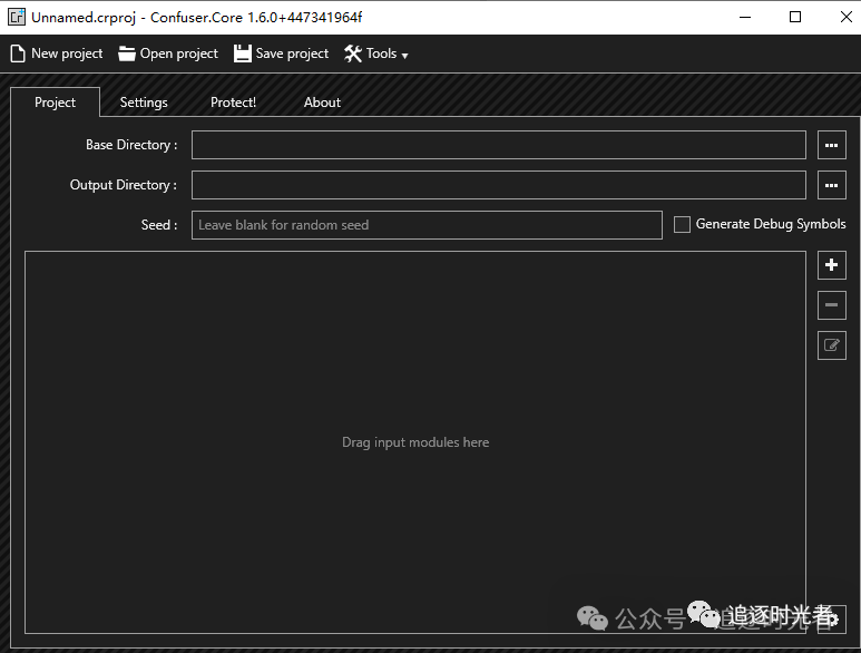 使用ConfuserEx工具混淆.NET Fx .dll文件添加需要混淆的.dll文件将待混淆的.dll文件拖拽进中间方框区域(Drag input modules here),如下图所示: