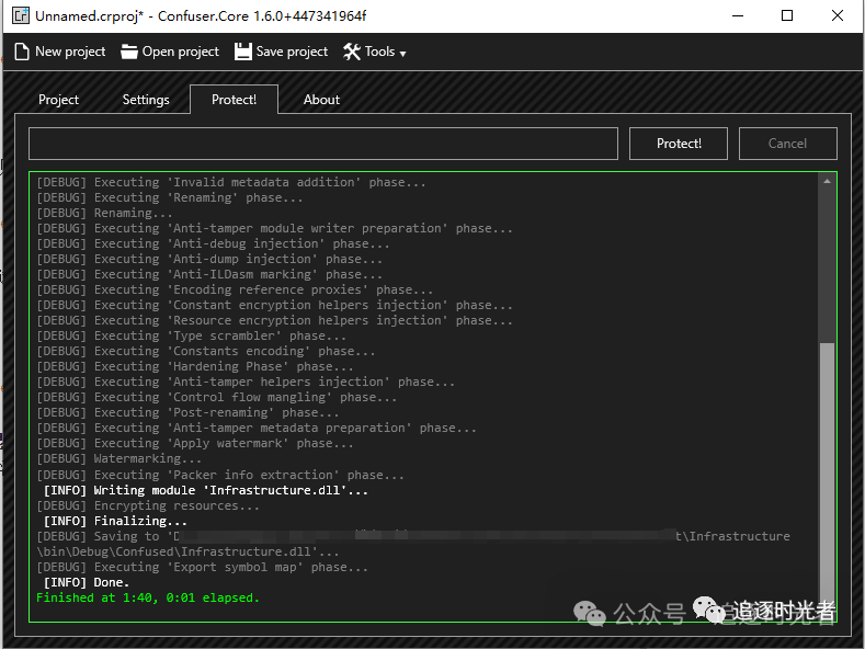 选择Proect!选项开始混淆点击【Protect!】,就开始混淆了,Finished代表混淆完成并成功。