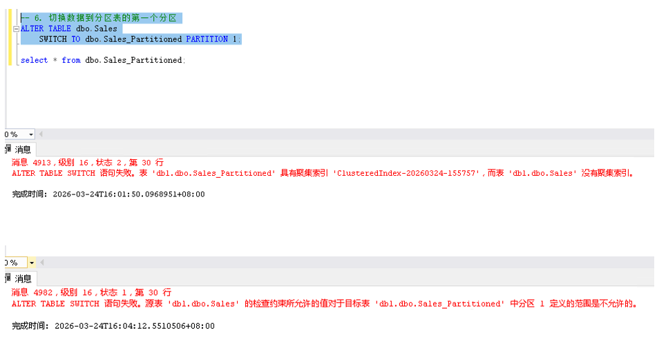 ALTER TABLE dbo.Sales SWITCH TO dbo.Sales_Partitioned PARTITION 1;select * from dbo.Sales_Partitioned;