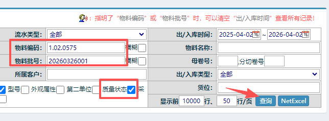 可以通过物料代码以及对应物料批号进行筛选查询,同时勾上质量状态查看对应情况。