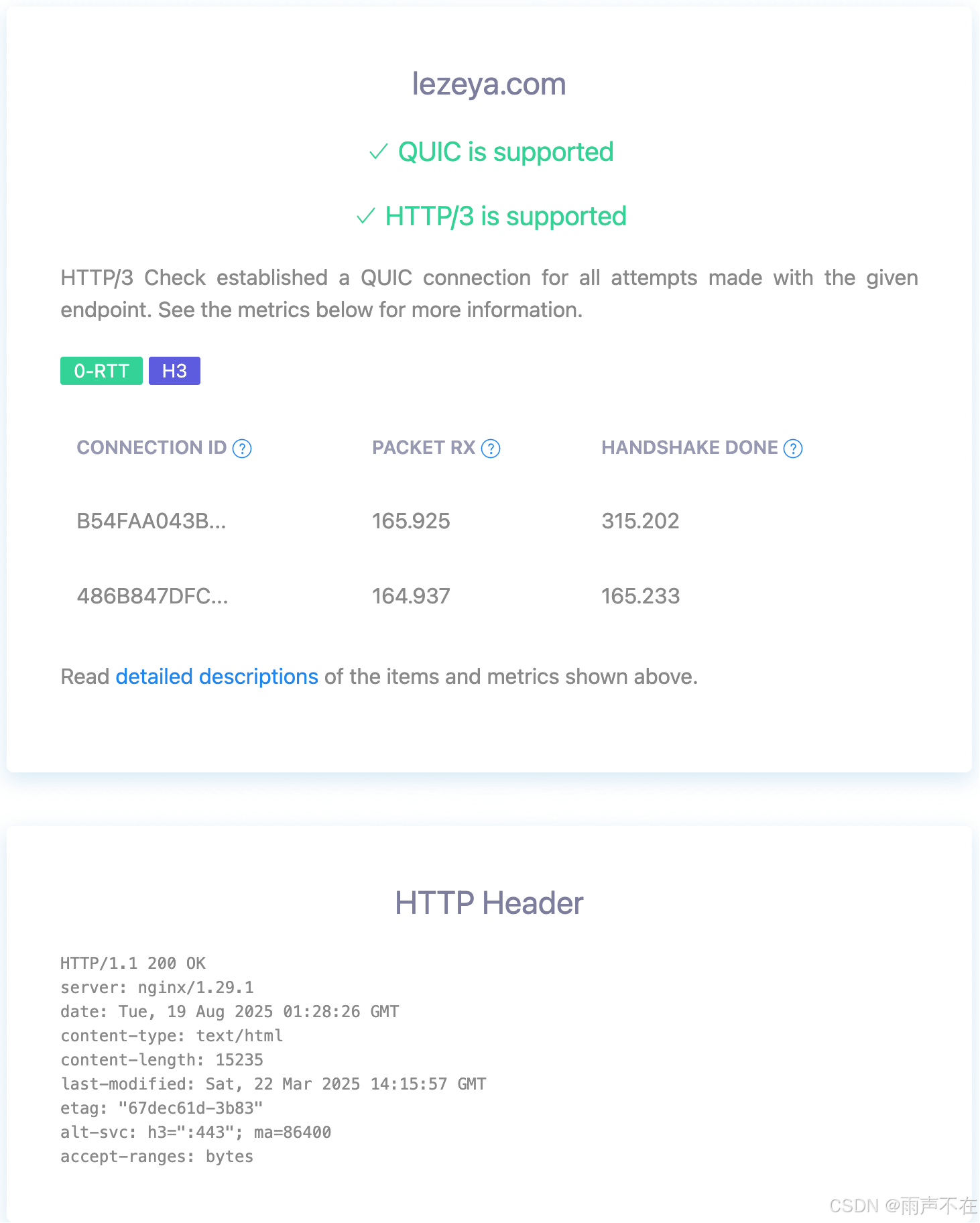 主要有2个配置,listen 443 quic reuseport; 和 add_header Alt-Svc 'h3=":443"; ma=86400';
