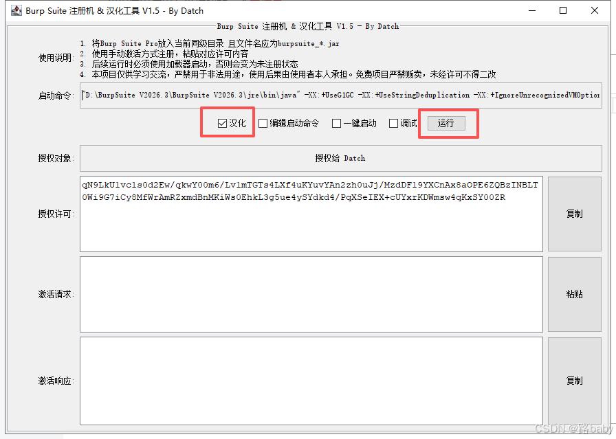 这个页面已经比之前的版本要简明许多了 这里我们只需要选择汉化即可(后面的以后有需要可以自行选择) 勾选后直接点运行即可唤醒burp(首次激活使用必须按照步骤)
