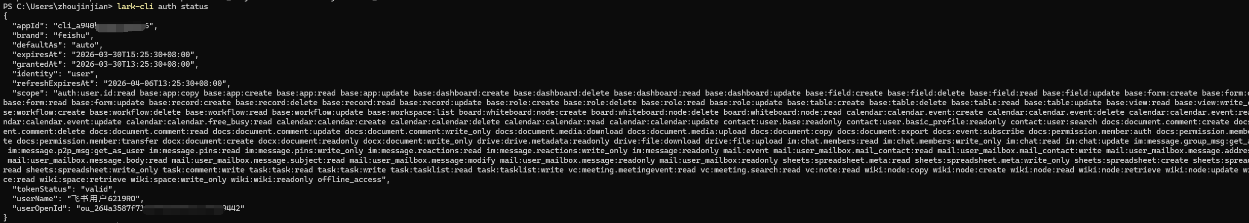 最后,我们来验证检查一下状态: 如果能正确获取飞书用户信息,以及刚创建并开通的App应用信息,则说明安装成功。