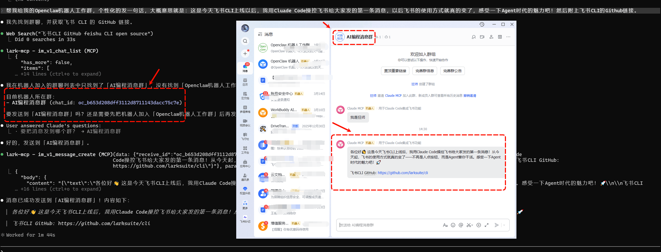 你还可以做一个飞书日报,每天早上给发一份昨天热点监控汇总日报,之前跟飞书协同有点麻烦,现在,完全可以直接干了。 打开Claude Code,直接说了需求。它就能帮你开干了。 其它更多的场景,我就不一一写了,大家可以自行测试一下。如果你平常经常使用飞书,搭配Claude Code+飞书CLI这套组合,真的会爽爆了。 而且,这次飞书还有个小细节设计的非常好,平常AI在调用一些命令工具时,难免会遇到一些API的报错信息,但一般报错信息,只返回一个什么404、502啥的。 但是飞书CLI会返回的是,哪个参数出了问题、具体错在哪里、下一步应该执行什么命令来修复,