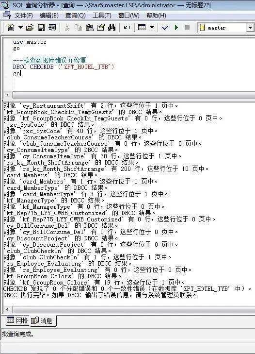 表结构损坏,表现方式是软件突然发生“莫名其妙”的问题: 如:如酒店系统的突然不能开房,或不能结账,或不能夜审,或不能查看某一个报表。反正用到某个表的某个功能,就不能操作。 但其他功能一切正常,而且数据库也没有置疑。 过去在ERP管理系统开发的这些年中,处理过几次这种情况。这种问题,单从软件上,很难找到原因。后面几经折腾,才找到原因: 原来是Sqlserver数据库中某一个或几个表损坏。 一般是因为断电、或前台人员强行关机、强行关闭软件(特别是当管理软件正在进行夜审、结算等大量的数据运算时)。 现把处理此情况的方法总结如下,希望对大家有用。 注意:下文中,ZPT_HOTEL_JYB是我所用的数据库名称,应用中,记得替换为实际的数据库名称: 第一步:检查并修复数据库,并找出哪个表损坏。 运行结果如上图。如有表结构损坏,损坏的表名会在“消息”页以红色的方式显示出来。
