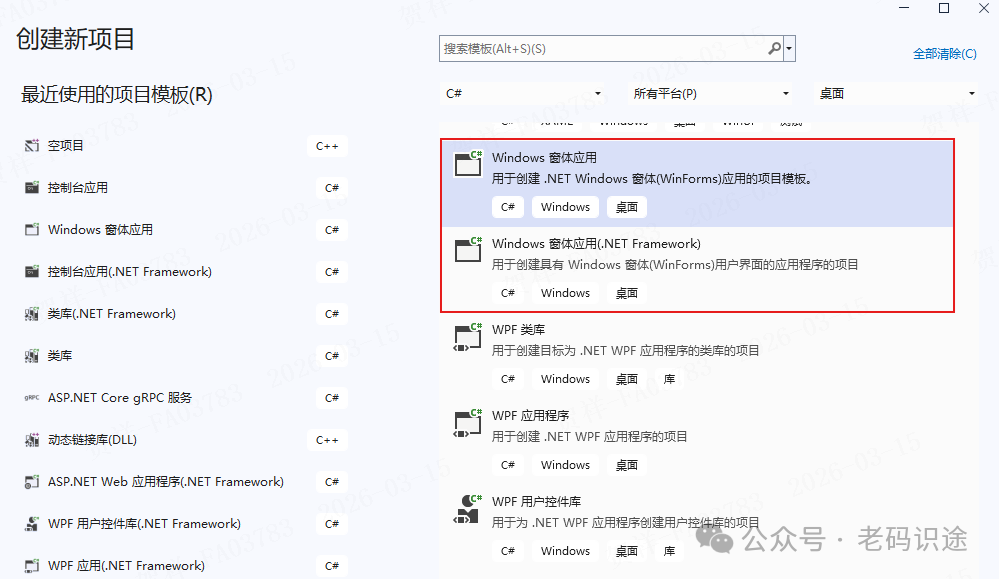 在打开的“创建新项目”向导页面,选择“Windows窗体应用”项目模板,它包含两个模板:一个基于.NET的Windows窗体应用模板,一个是基于.NET Framework的Windows窗体应用模板。在此我们选择第一个,然后点击“下一步”,打开“配置新项目”对话框。