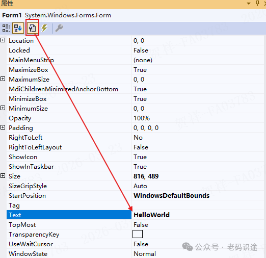 在Visual Studio设计器,选择Form窗体,在右下角的属性窗口中,可以直接设置对应的属性,如下所示: