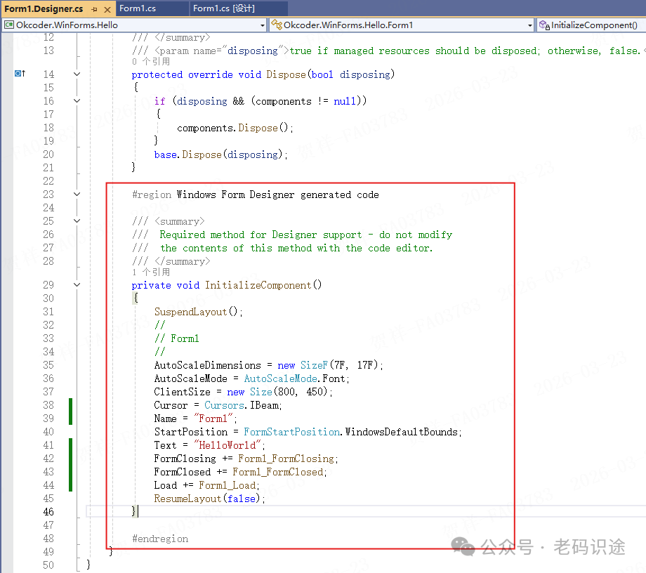 2. Form2.Designer.cs,当向窗体拖放控件时,会自动生成控件的构建,布局相关代码,以及用户通过属性窗口设置的属性等内容。