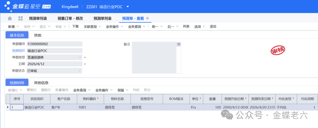 示例先录入一个100的预测单,客户和物料要录入,还有时间。 再录入一个销售订单,客户和物料要和预测单一致。