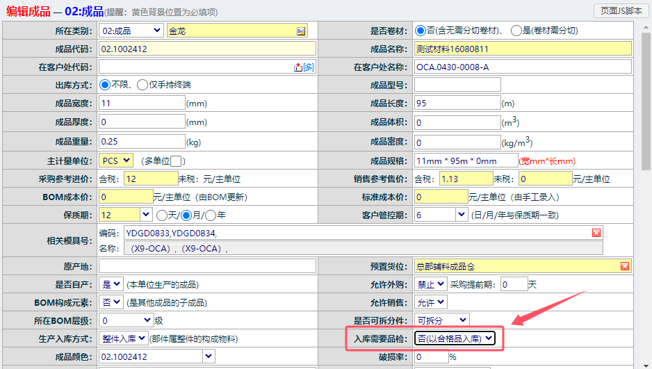 :原材料采购入库为待品检状态,怎么关闭此功能,将物料自动作为合格品入库?![]() 以管理员或有权限身份进入ERP系统-》系统管理-》物料管理-》物料信息维护: 找到此物料: