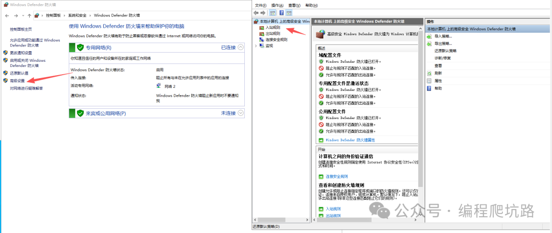 1. 1. 控制面板 → 系统和安全 → Windows Defender 防火墙 → 高级设置