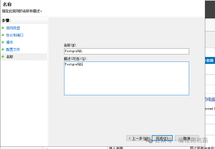 4. 4. 允许连接 → 下一步 → 名称填:PostgreSQL