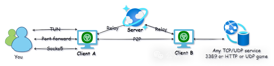 端口转发: 在无法使用虚拟网卡,或者不想使用虚拟网卡的时候,可以使用一对一端口转发实现相互访问,相关说明请查看《关于单隧道实现多服务访问的端口转发状态管理的研究》。