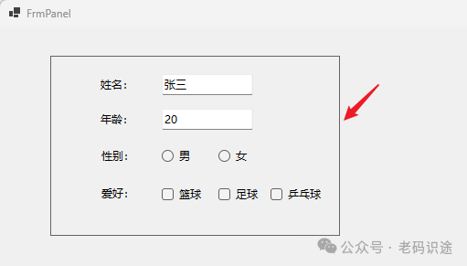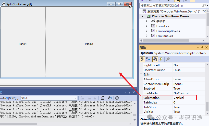 在Visual Studio中进行窗体设计时,Panel控件会有一个虚线边框,用于标识Panel控件的有效范围,如下所示: ![]() 当实际运行起来时,是不带边框的,如下所示: ![]() 如果需要设置Panel容器的边框,可以设置BorderStyle属性,默认为None,表示无边框,设置为纯线(FixedSingle),效果如下所示: ![]() 如果Panel中子控件的位置大于Panel控件的大小,默认是会自动裁切,不显示滚动条;如果需要显示滚动条,则需要设置AutoScroll属性为true,如下所示: ![]() Panel控件设置背景色,同时会将背景色应用到其所包含的子控件中(如:Label,RadioButton,CheckBox等),如下所示: ![]() 如果不想子控件和Panel容器控件背景色保持一致,则需要单独设置子个控件的背景色,如下所示: ![]() 注意:默认添加的Panel控件,是不自动填充到Form窗体中的,如果需要自动填充窗体,则需要设置Panel的Dock属性为Fill。 SplitContainerSplitContainer控件可以被视为一个组合控件,它由一个可移动条分隔成两个面板。 当鼠标指针位于条上时,指针的形状会改变,以指示该条是可移动的。此控件可以创建复杂的用户界面,如上下布局,左右布局等常见形式;SplitContainer关键属性如下所示: