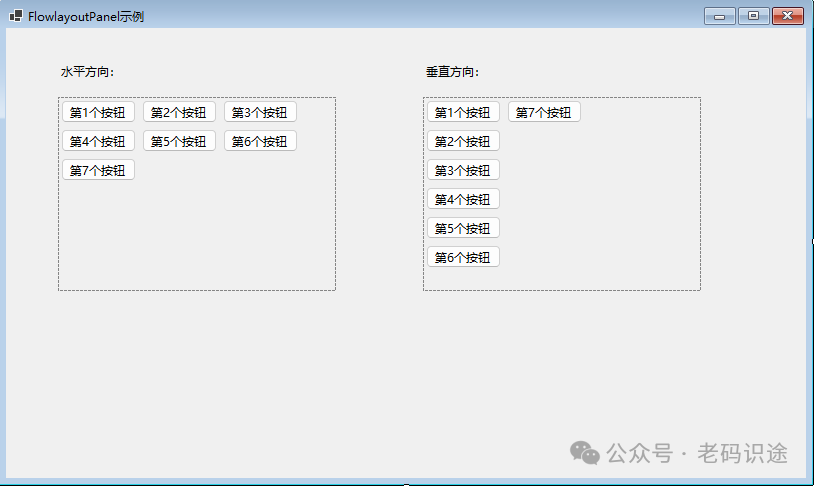 示例效果如下所示: ![]() FlowLayoutPanelFlowLayoutPanel控件按水平或垂直流方向排列其内容。 当行宽或列高不足以显示它的内容时,它的内容可以从一行换到下一行,或从一列换到下一列; 或者,可以剪切其内容,而不是进行换行。 FlowLayoutPanel关键属性: