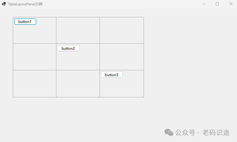 三个按钮分别位于(0,0),(1,1),(2,2)位置,效果如下图所示: ![]() 基于.NET的Windows窗体编程之WinForms入门简介 基于.NET的Windows窗体编程之WinForms控件简介 基于.NET的Windows窗体编程之WinForms布局简介 阅读原文:https://mp.weixin.qq.com/s/zYbV-i170FSSdoYrpZNKGg 该文章在 2026/4/21 10:05:14 编辑过 |