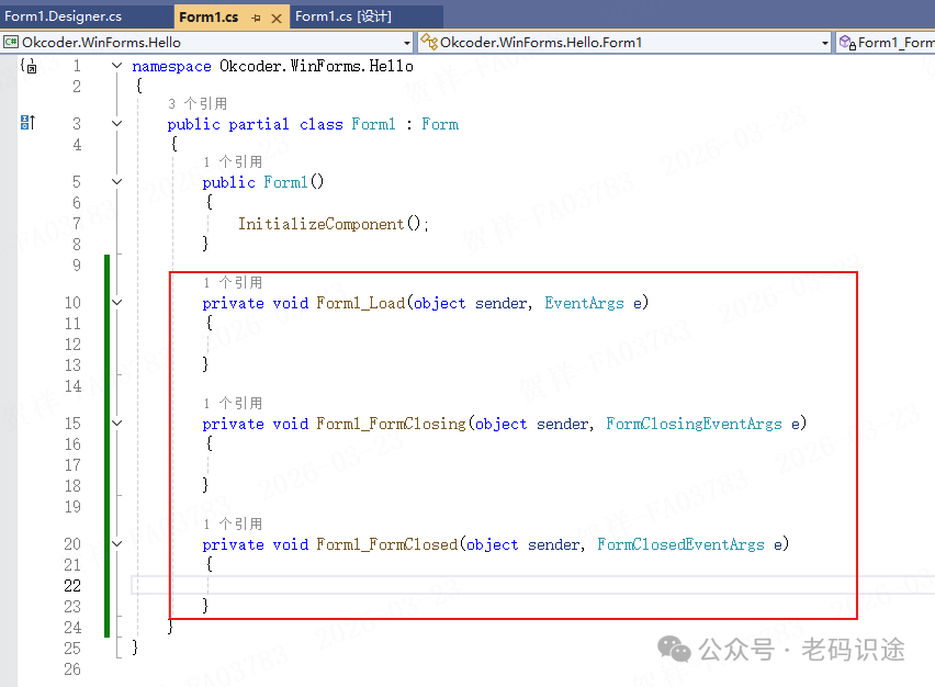 在Visual Studio设计器,选择Form窗体,在右下角的属性窗口中,可以直接设置对应的属性,如下所示: ![]() 事件也可以在属性窗口切换事件Tab页后进行双击设置。如下所示: ![]() 当通过属性窗口中设置相应的属性和事件后,会在窗体对应的Designer.cs类文件中自动生成相关代码,如下所示: ![]() 并且在表单对应的.cs文件中生成对应的事件委托方法体,可以在其中编写业务逻辑,如下所示: ![]() 运行调试