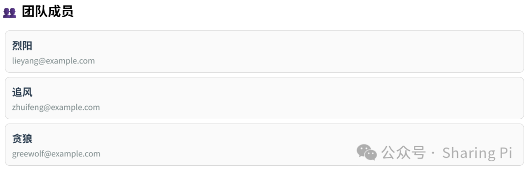 <h2>👥团队成员</h2><div id="container"></div><template id="userTemplate"> <div class="user-card"> <h3 class="user-name"></h3> <p class="user-email"></p> </div></template>