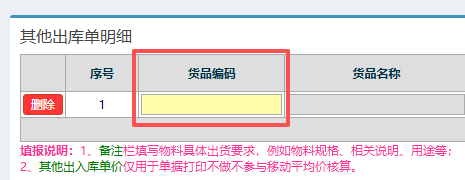 操作步骤:仓库管理——物料出库管理——其他出库管理——新增其他出库单;进入页面如下图所示: 选择对应的出库类型;点击“货品编码”下的方框;跳出物料查询页面,如下图所示页面: