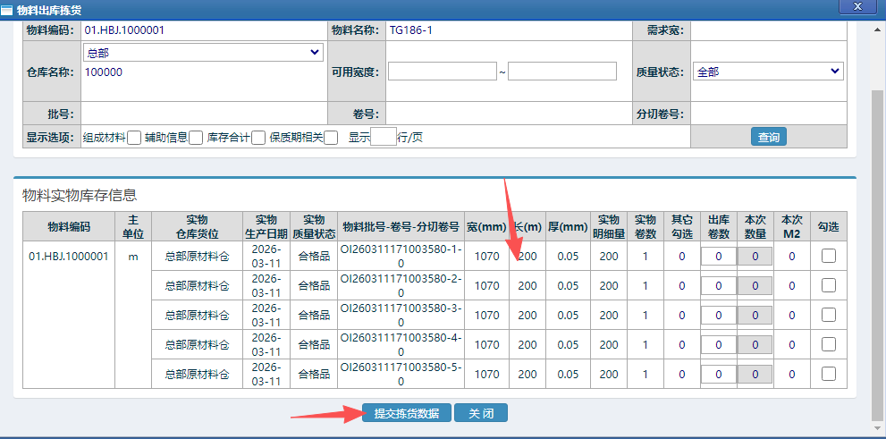 用物料名称查询定位,选中物料后,如下图所示: