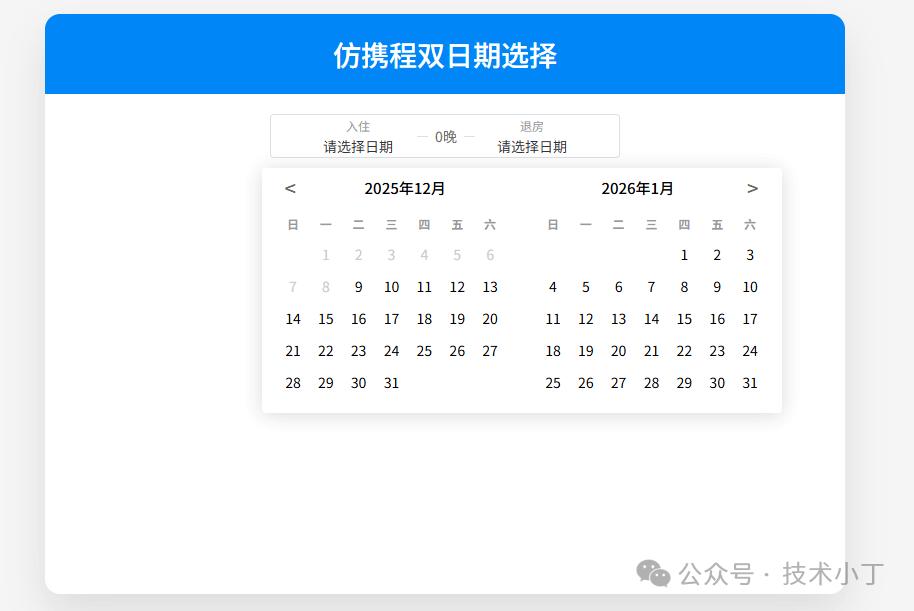 在旅游预订网站中,日期选择器是一个核心组件,特别是像携程这样的平台使用的双日期选择器,能够让用户直观地选择入住和退房日期。本文将详细介绍如何使用HTML、CSS和JavaScript实现一个仿携程的双日期选择器。效果演示这个日期选择器具有以下特点:双面板日历展示,方便用户同时查看两个月份直观的日期选择交互,支持入住和退...
