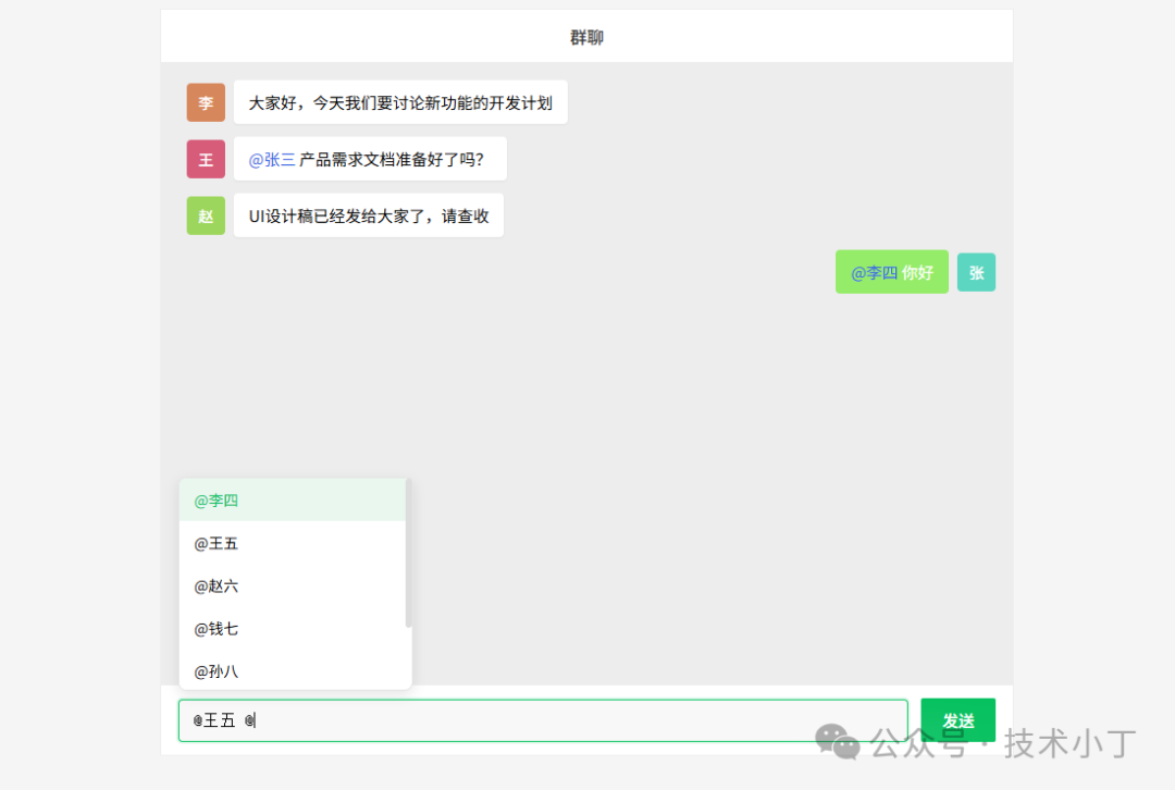 群聊中的@功能能够让用户精准地提醒特定成员参与讨论,把群聊从“大喇叭”变成“定向呼叫器”,提高沟通效率。本文将介绍如何使用HTML、CSS和JavaScript实现群聊@功能。效果演示该群聊@功能包含完整的聊天界面,支持发送消息、接收消息显示,以及核心的@提醒功能。当用户在输入框中键入@符号时,会自动弹出群成员列表,支...