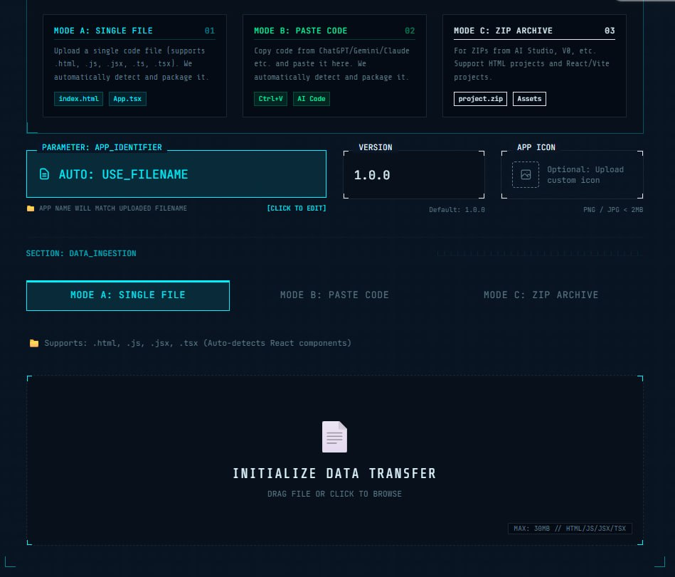 ⭐网站功能:代码转AndroidAPK📁网站简介:一款将HTML或React项目快速转换为AndroidAPK应用,无需编写代码,只需通过简单的上传或粘贴操作,即可将AI生成的代码打包成可安装的应用。站支持...