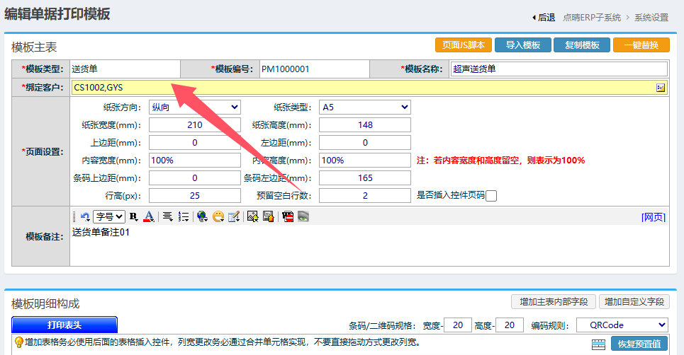 erp如何将销售订单默认版本改成送货单版本?注意送货单模板设计时,有一个绑定客户字段,如果设置了需要显示此模板的客户,那么这个客户的送货单打印时,就会自动调用这个绑定了此客户名称的模板作为默认显示模板。以管理员身份进入点晴ERP-》系统管理-》打印设置-》单据打印模板设置:找到需要维护的模板,点击编辑按钮:在上面的绑定...
