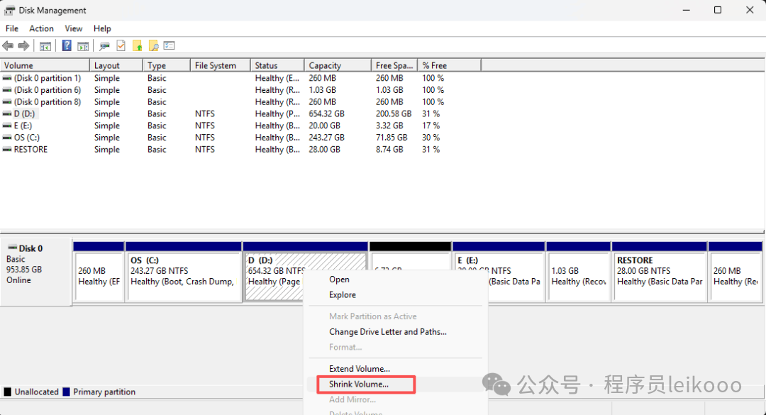 风险提示风险操作,非必要不要操作!!!一定要设置系统还原点!!!设置系统还原点参考这篇文章[1]操作流程1、首先使用Window自带的软件创建unallocated空间win+x->选择DiskManagement(磁盘管理)2、找到磁盘空间较大的盘符3、在对应的盘符右键选择ShrinkVolume(压缩卷)image...