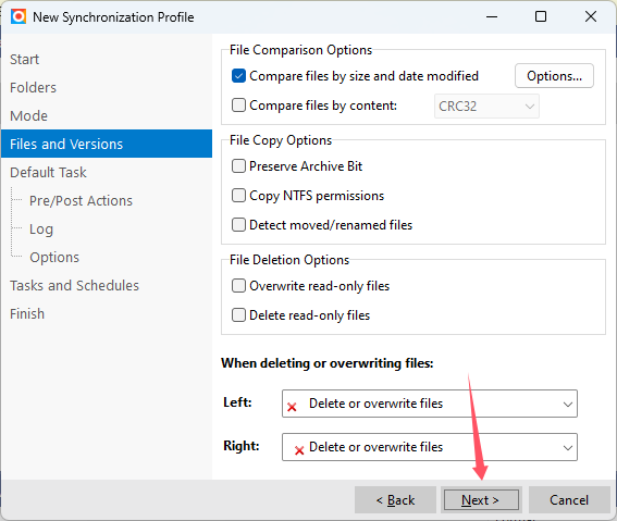 6、确认无误后,点击“Next” 上面是设置同步备份方法,建议按照以上设置即可。 Mode选择“Simple”简单备份方式; Left and Right(备份来源和目的地): File exists on Left only,选择“Copy from Left to Right”,意思是如果文件只在左边存在时,则从左边复制到右边; File exists on Right only,选择“None(skip file)”,意思是如果文件只在右边存在时,则跳过,什么也不做; File exists on Left and Right, and are different,选择“Always copy from Left to Right”,意思是如果文件在两边都存在并且不同时,则永远只从左边复制到右边; File exists on Left and Right, and are the same,选择“None(skip file)”,意思是如果文件在两边都存在并且相同时,则跳过,什么也不做; 7、然后点击“Next”